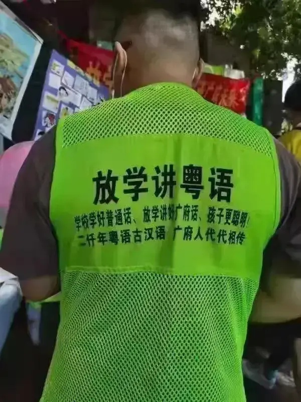 普通话越来越普及,大家都在为粤语传承着急,大环境无法改变,那就从身边小行为做起,一位市民穿着印有发扬粤语文字的背心出门,主题为【放学讲粤语】:学校学好普通话、放学讲好广府话、孩子更聪明,二千年粤语古汉语,广府人代代相传事实上,现在不管是传宗接代的本土年轻广州人、抑或新广州人,他们的孩子无论在学校还是家庭清一色讲普通话,家长们也不得不迁就孩子说广谱